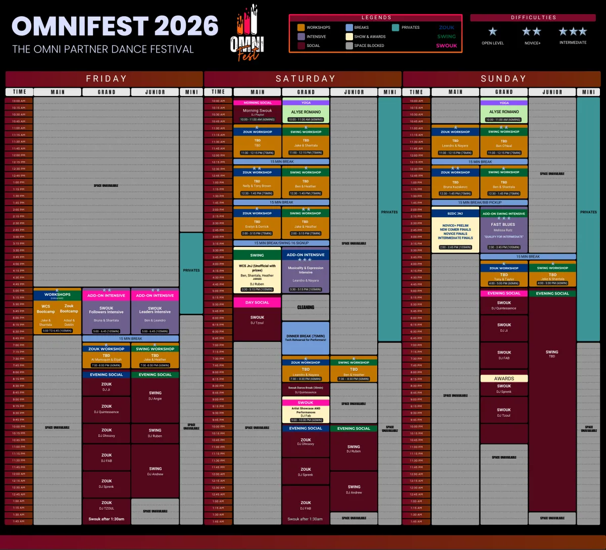 The Mega Pass includes everything in the standard Full Pass (workshops, socials, performances, competitions viewing) plus all three Add-On Intensives. It’s the best way to get the full Omnifest experience if you want to learn from every intensive while still enjoying all the main programming.